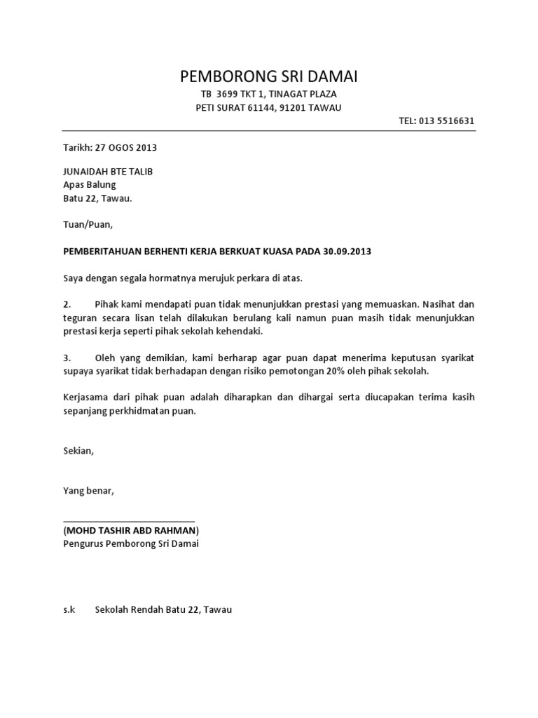 Contoh surat rasmi berhenti kerja Bahasa Melayu dan Bahasa Inggeris. Surat Pemutusan Hubungan Kerja ini merupakan surat yang dikeluarkan oleh perusahaan atau instansi kepada seorang karyawannya yang bertujuan untuk mengakhiri kerja sama antara pihak. B Agensi hendaklah mempamerkan pemberitahuannotis sebut harga di papan kenyataan awam Agensi masing-masing selain daripada mempelawa sebut harga kepada penyebut harga yang telah dikenal pasti.